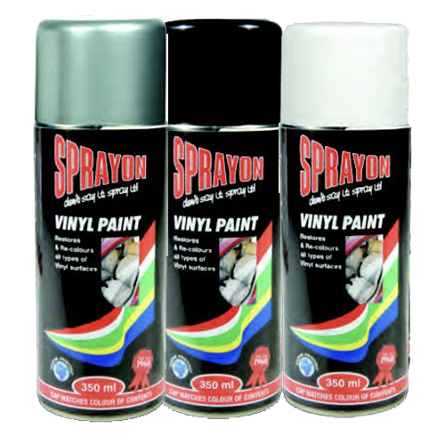 Sprayon Vinal & PVC Paint A speciality paint developed for use on vinyl such as car seats, PVC and certainplastics. Use Sprayon Plastic Keycoat or Sprayon Plastic Primer to prepare the surface before spraying.Available in white, black and grey.Supplied on 350ml cans.